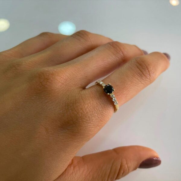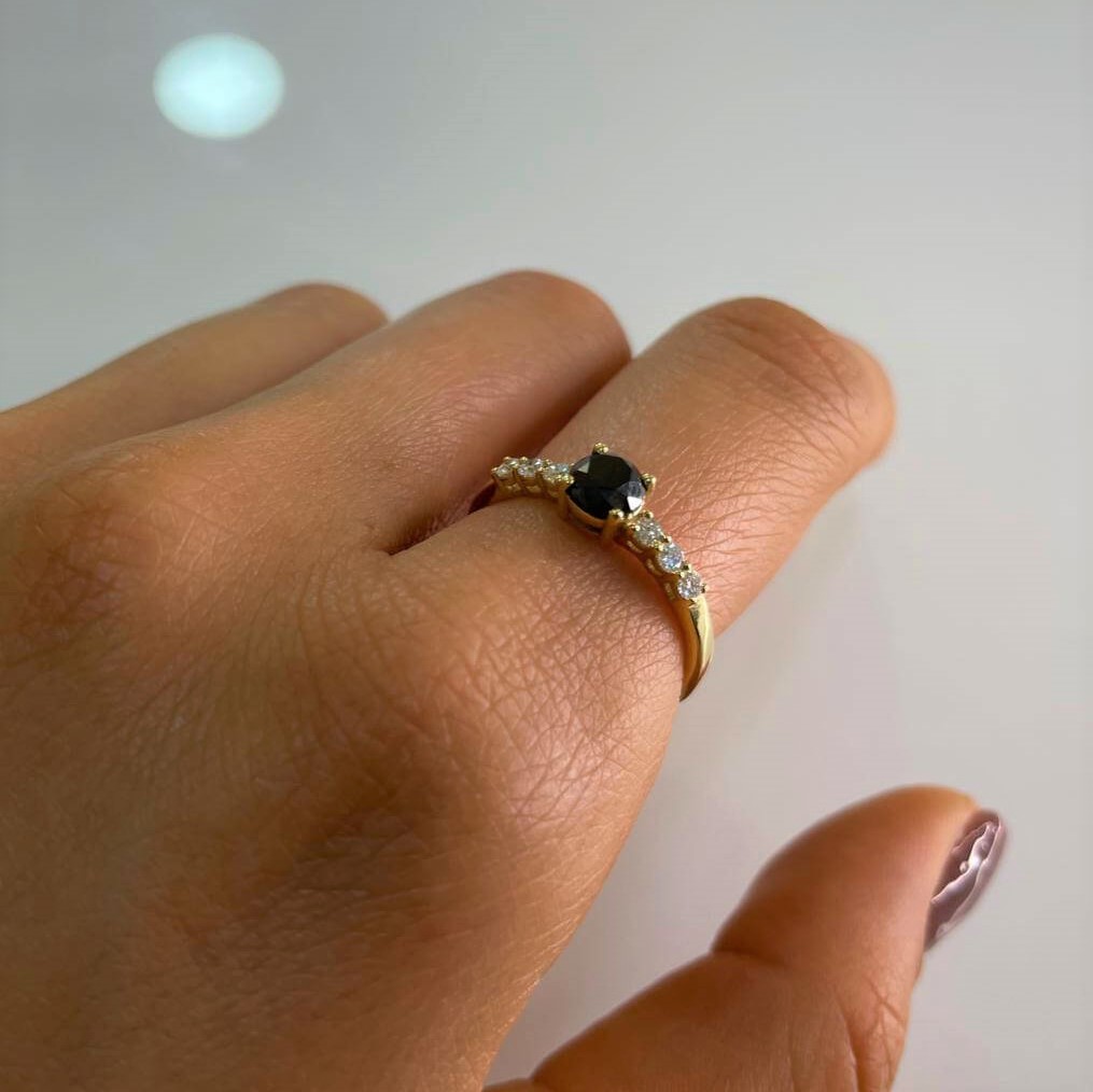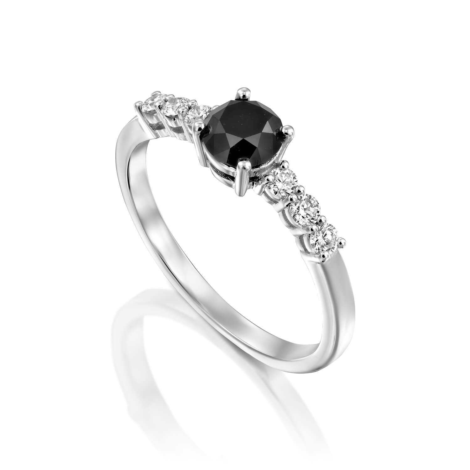 A fashionable and delicate black diamond engagement ring set in the center with a shiny 0.60 carat black diamond and on each side sparkling diamonds weighing 0.17 carats in total. A black diamond ring is full of elegance and chic, and the white diamonds enhance the black diamond in the center and give it a special look.